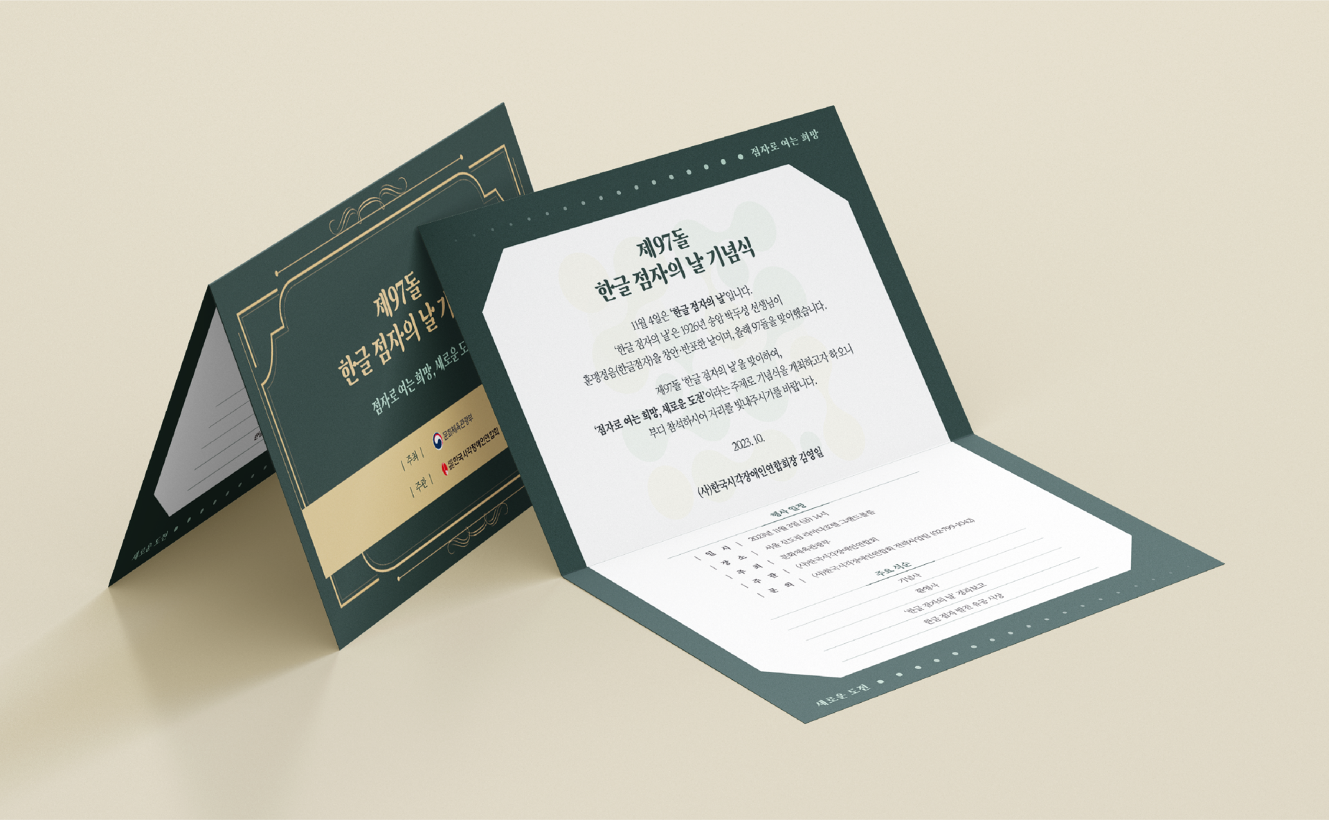 "점자로 여는 희망, 새로운 도전"이라는 슬로건에 걸맞게 성장과 활력이라는 상징적 의미를 지닌 초록색을 메인 컬러로 설정하였으며,이어진 원들의 조합으로 점자의 의미와앞으로의 한글점자의 방향성을 함축적으로 표현하였습니다.