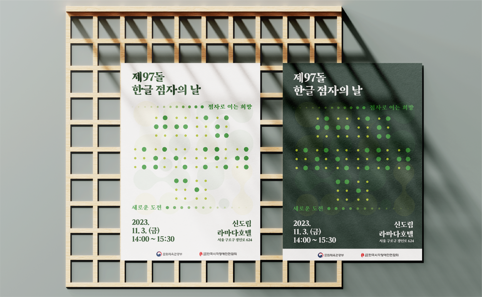 "점자로 여는 희망, 새로운 도전"이라는 슬로건에 걸맞게 성장과 활력이라는 상징적 의미를 지닌 초록색을 메인 컬러로 설정하였으며,이어진 원들의 조합으로 점자의 의미와 앞으로의 한글점자의 방향성을 함축적으로 표현하였습니다.