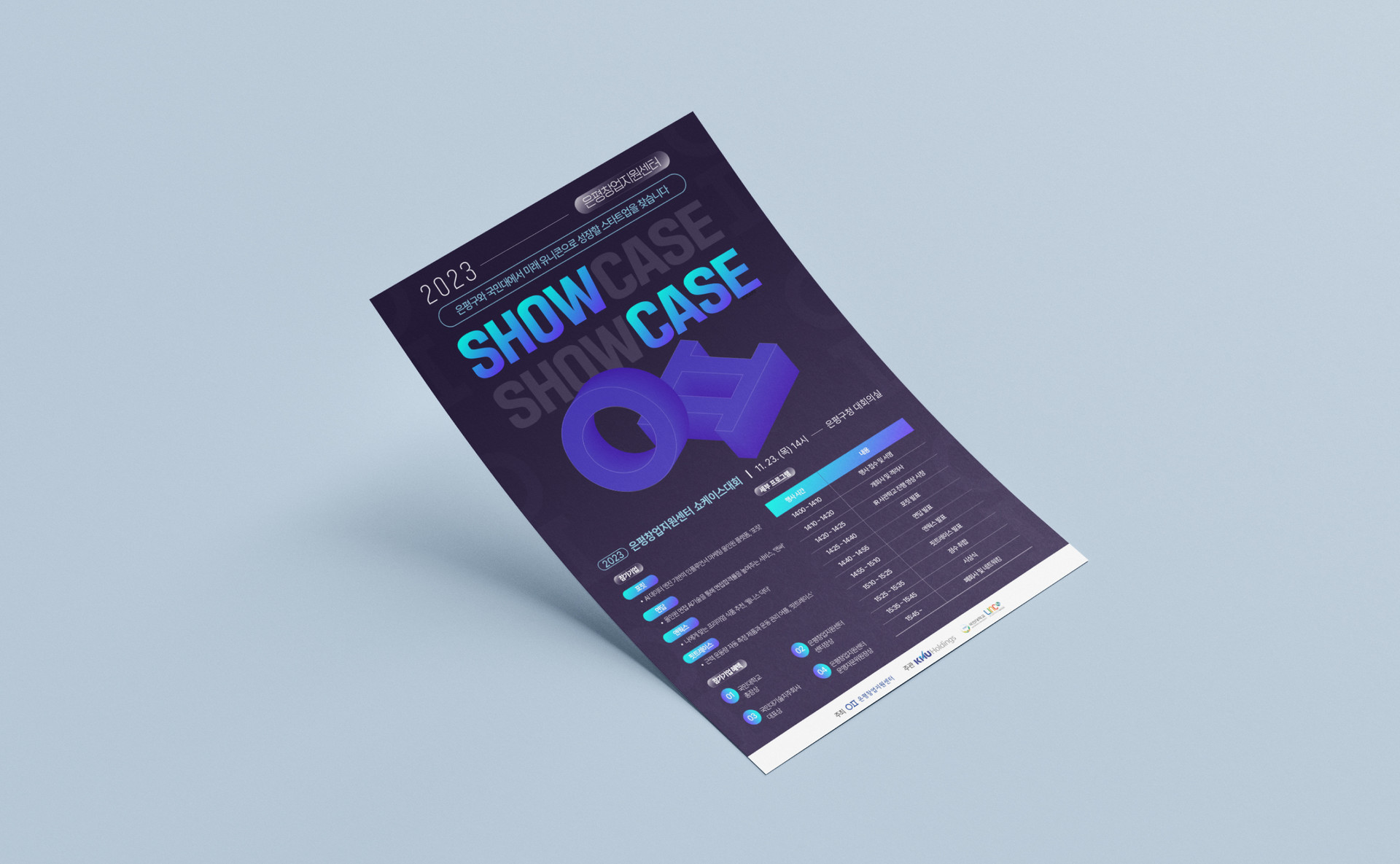 초성 "ㅇ", "ㅍ"을 입체적으로 형상화하여 행사 타이틀인 은평창업지원센터 쇼케이스대회를 상징적으로 표현하였습니다.