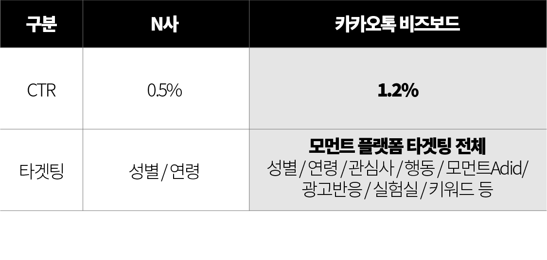 카카오톡의 트래픽 또는 오디언스 타겟팅을 통한 코어 타겟군을 대상으로 광고를 노출하여 높은 CTR 확보가 가능합니다.