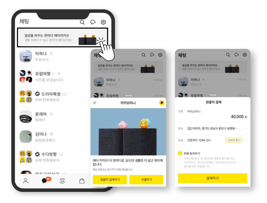 카카오톡 채팅 목록 탭을 활용한 프리미엄 광고 상품으로, 목적에 맞는 랜딩페이지 활용이 가능하다는 장점이 있습니다.