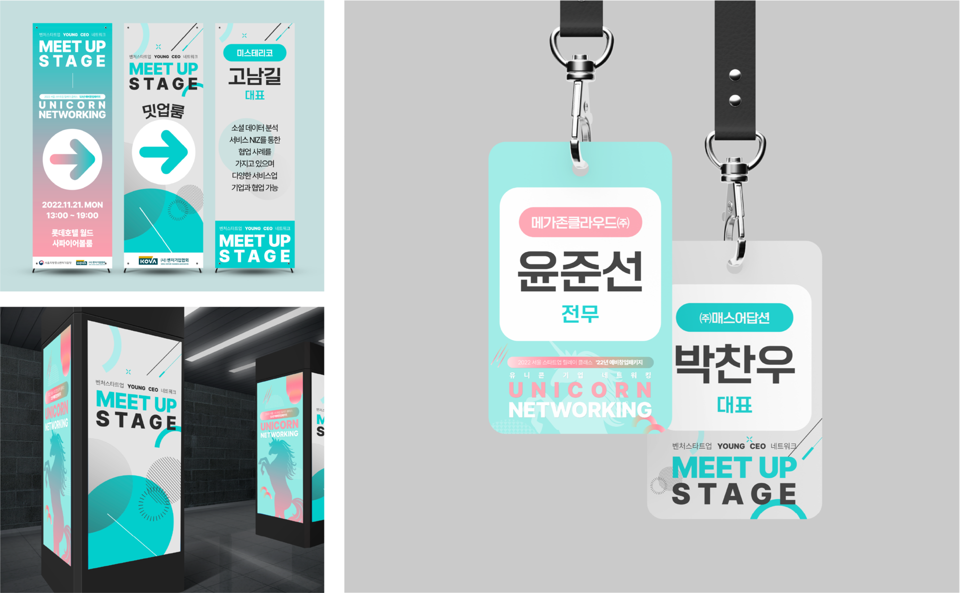 선배 벤처 기업을 민트, 유니콘 기업을 핑크로 설정하여그라데이션 및 여러 기하학을 통해 두 기업의 화합을 표현하였습니다.